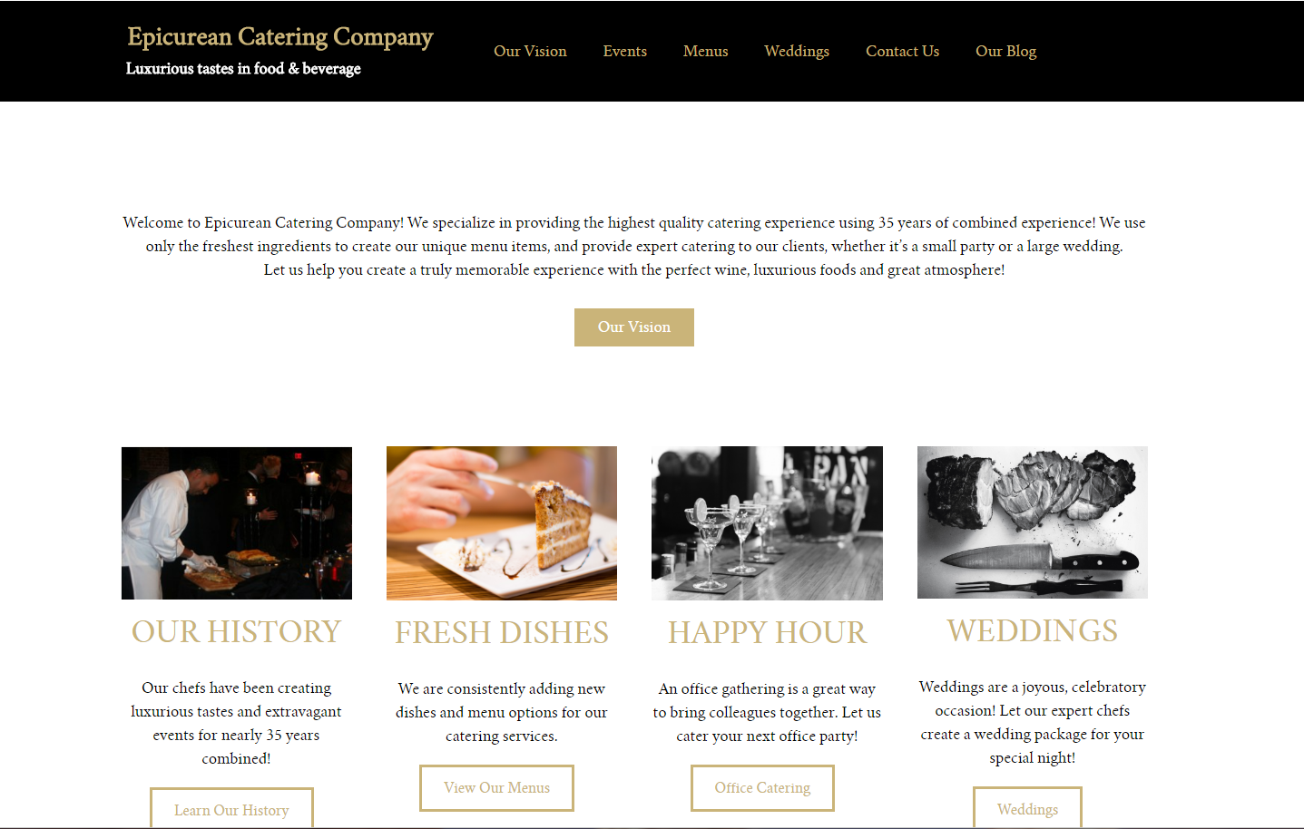 I designed and developed the website for Epicurean Catering Company, and Chef Tomas’s other companies, Juice Market 101 and Chef’s Gourmet Market. I am also the Marketing Director for Epicurean Catering Company, and developed a completely custom online marketing strategy, including blogging, social media management, advertising, and SEO integration.